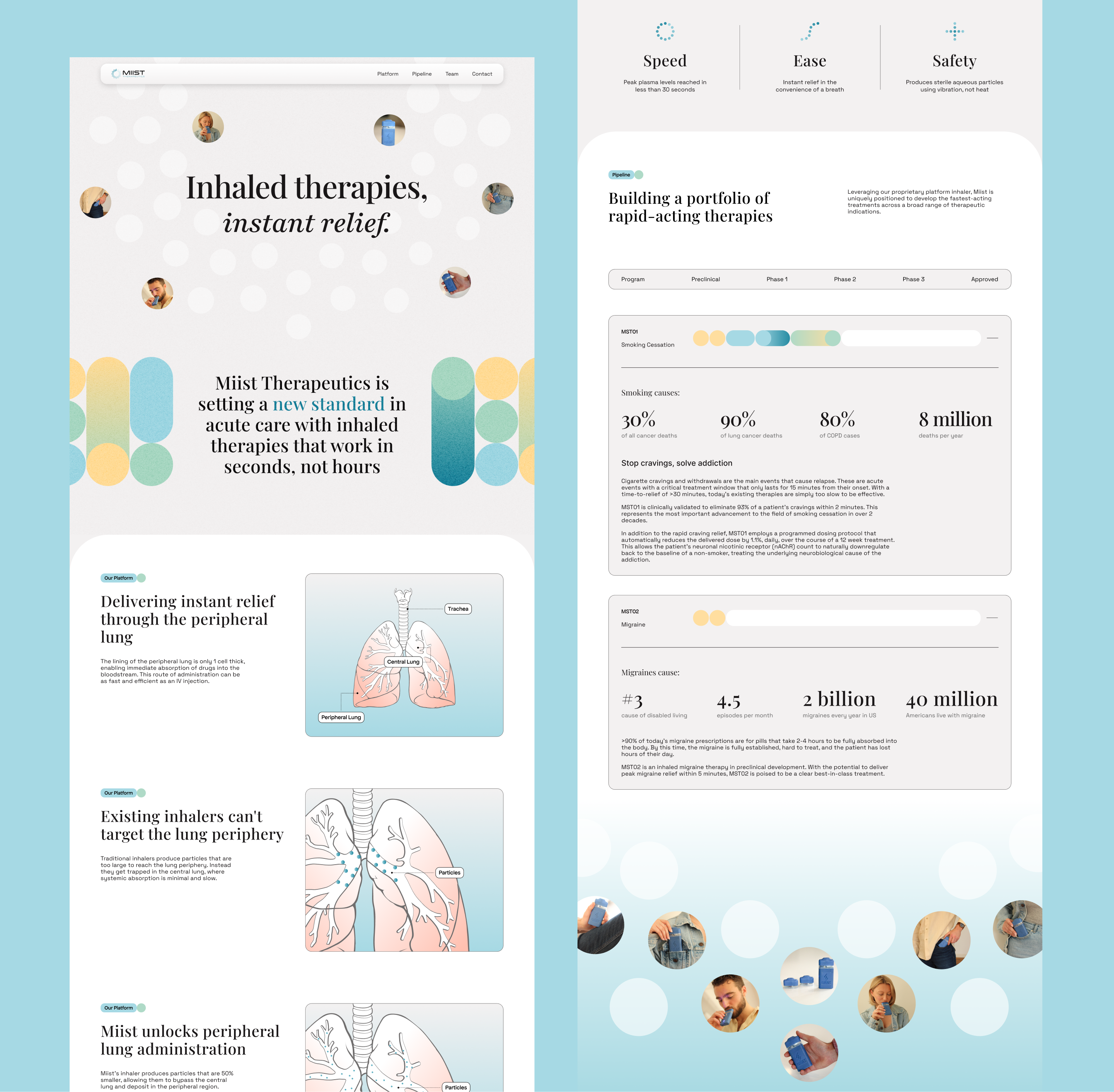 Miist Therapeutics is a biotech startup developing a novel inhalation drug delivery platform designed for ultra‐rapid systemic absorption via the lung periphery. They’re initially focusing on smoking cessation and migraine treatment, backed by seed investors, and claim fast onset of action (seconds rather than minutes/hours).